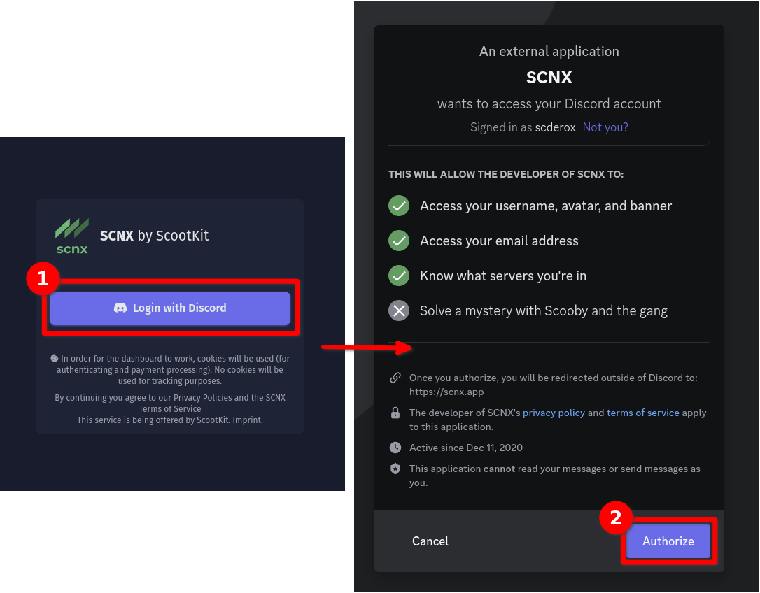 Head over to scnx.app to get started. You'll be asked to login with your Discord-Account. To do that, just click on the "Login with Discord" button. If you're wondering why we need access to certain data of you (" scopes"), you can find the answere in our FAQ.