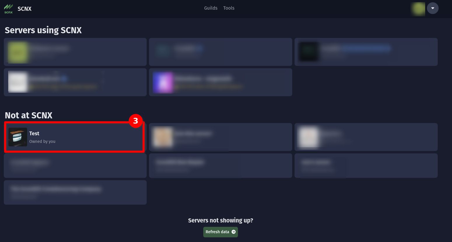 Please make sure you are the owner of a server or have the administrator permission to add it to SCNX. If not, ask the owner or an administrator to set up SCNX and give you Trusted Admin Permissions. If you've recently created a server, and it is not visible in the dashboard, refresh the server list using the "Refresh data" button on the bottom of the page.