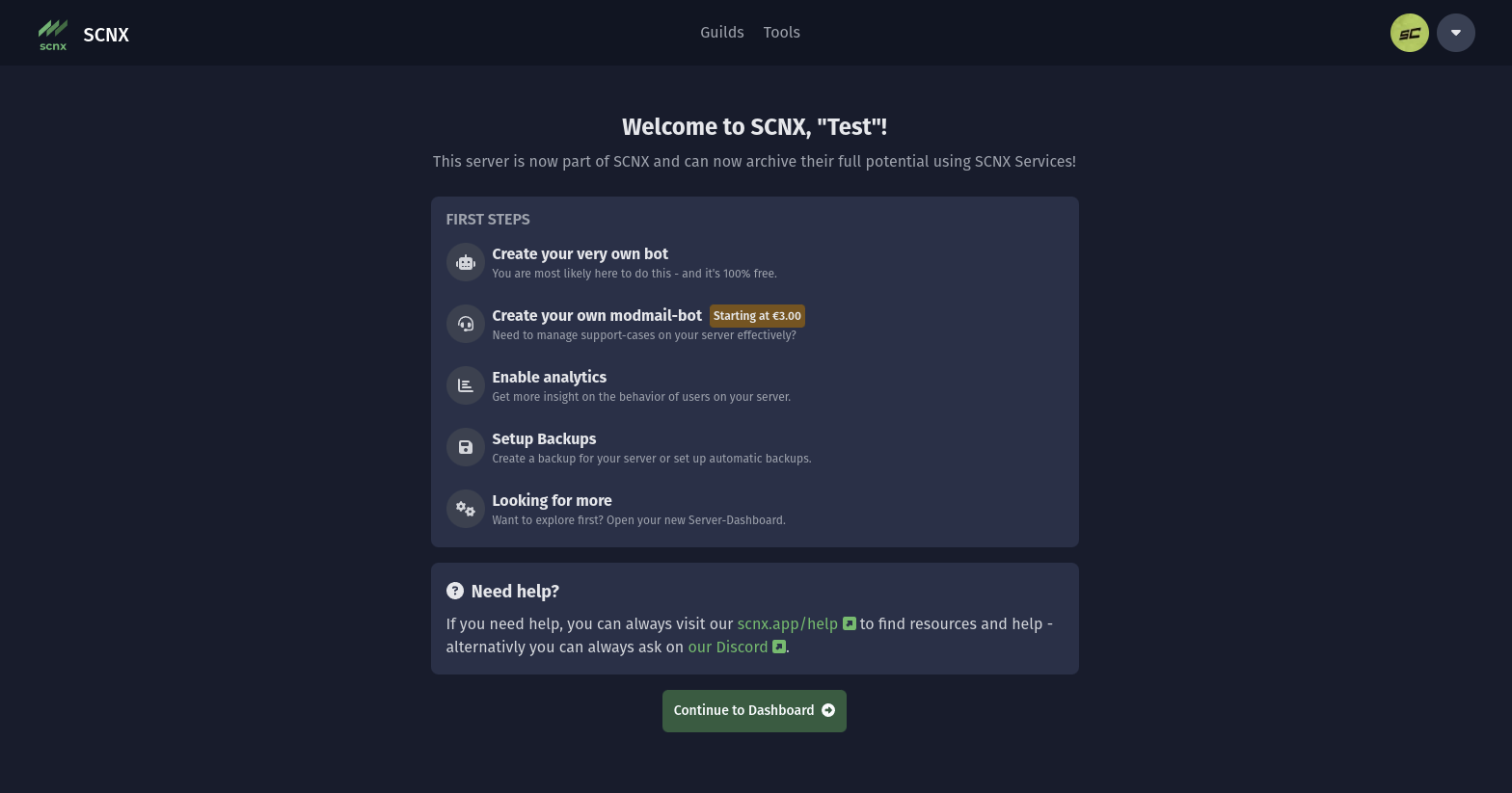 Your server has been successfully added to SCNX 🎉 You can now start by creating your own bot or modmail-bot or explore all features on your own - our documentation & staff on our Discord is always here to help.