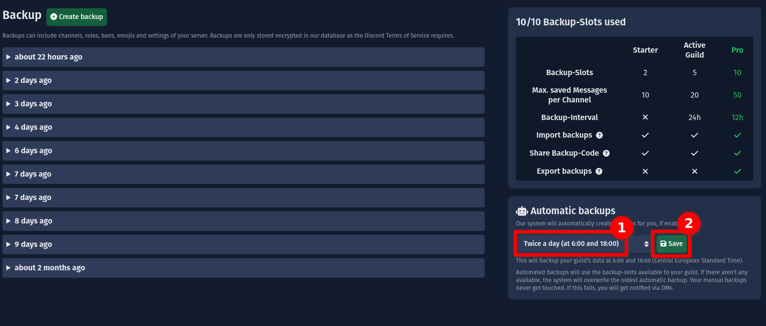 | Guild-Settings | Backups will include Server name, icon, settings (like the AFK channel), Auto-Moderation rules and more |