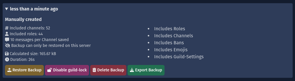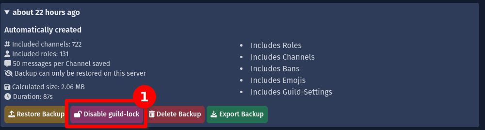 - Disable / enable Guild-Lock: Allows / Disallows your Backup to be restored on other servers. Please read more in the restore backups on other servers section.