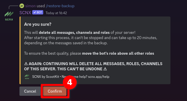 After confirming, the SCNX Bot will start by deleting all existing channels and roles from your server. Once that's done, the SCNX Bot will start restoring your data. This might take up to 20 minutes or even more. Once done, the SCNX Bot will ping you (or DM you). This will also happen if something went wrong.